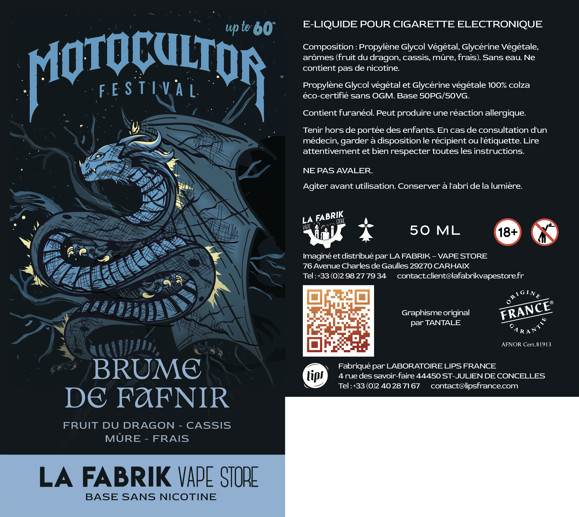La Brume de Fafnir est un eliquide imaginé et crée par La Fabrik - Vape Store en partenariat avec le festival Motocultor. Fabriqué dans les laboratoires de Lips, La Brume de Fafnir est un eliquide certifié Afnor et conçu en France.